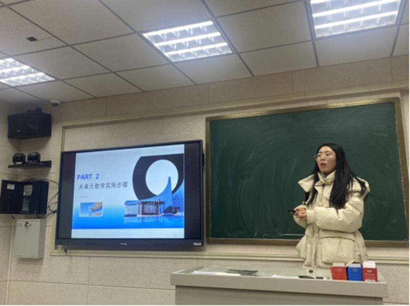 上街区五云学校七年级英语备课组长杨凯莉对新教材Unit3 My School进行单元整体解读以及分课时教学设计展示。杨老师提出单元整体教学要先充分研读教材,结合新课标探究单元主题意义,围绕单元Big Question来梳理单元主题的内容框架以及语言框架。在读写课时设计环节她特别强调要关注学生在主题意义探究下的思维进阶过程,强调语篇间的逻辑,引导学生由浅入深分析文章结构,注重学生思维方式的培养。