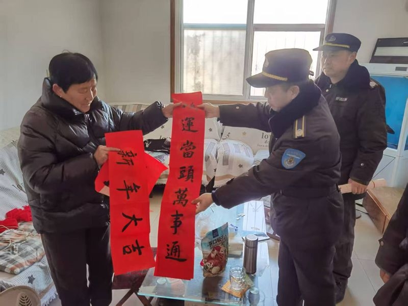 居民李阿姨高兴的说:“你们那么忙,平日里没少帮我们,过年了还不忘我们,一看这幅红红的春联,家里就有年味儿了,太感谢你们了。”