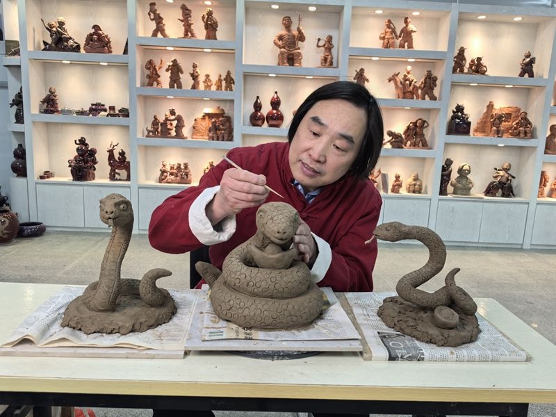 泥塑大师张振福创作非遗泥塑《祥蛇献瑞》迎蛇年
