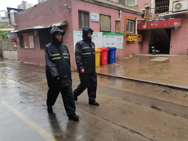活动中,巡防队员穿着巡防雨衣,脚踩雨水,一步一步地前行。雨水模糊了他们的视线,但他们的目光依然坚定,专注地搜索着每一个可能存在积水隐患的地方。巡防队员沿着街道仔细查看,不放过任何一个角落。遇到积水较深的路段,他们就停下来,认真测量积水的深度,并做好记录。巡防队员拿着工具,清理被杂物堵塞的下水道口,努力让积水能够更快地排出。他们的鞋子湿透了,裤腿沾满了泥水,但他们没有停下脚步,继续在雨中奔波。