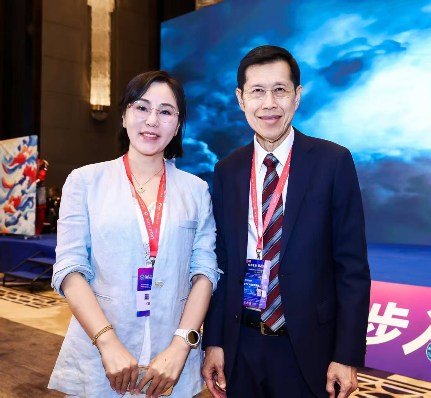 世界无人机大会主席杨金才先生向甘肃通航智能领奖代表刘春艳女士表示祝贺