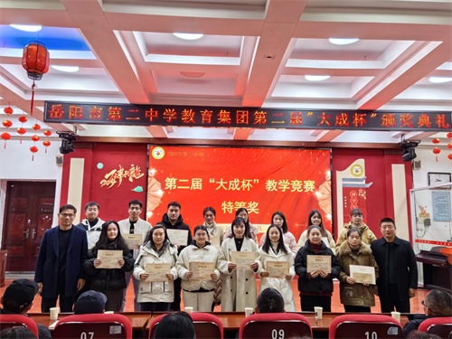 12月23日下午,由岳阳市第二中学、岳阳市第六中学、岳阳市岳阳楼区郭镇中学组成的二中教育集团第二届“大成杯”教学竞赛颁奖典礼在岳阳市第二中学会议室隆重举行,对童婷等89位表现优异的参赛选手分别进行表彰勉励。12月25日下午,该集团内三校分别召开“大成杯”教学竞赛参赛教师总结与反思座谈会,宣告此次竞赛活动正式收官。