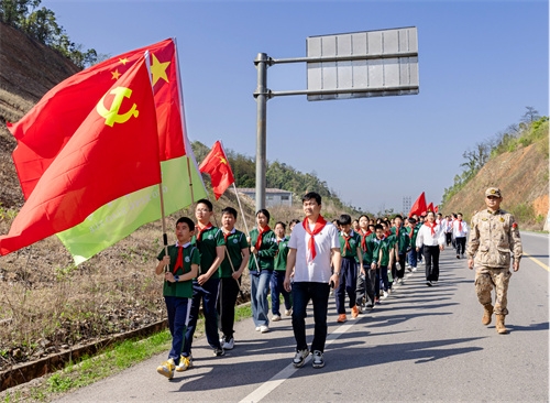 春风寄哀思,赤子祭忠魂。为传承红色精神,增强学生爱国情怀,3月25日上午,岳阳楼区郭兴小学与新路口小学组织四至六年级学生、家长代表、教师代表及驻地民兵连官兵共300余人,徒步前往“逐梦海天的强军先锋”张超烈士陵园,开展清明祭英烈国防教育活动。本次活动岳阳楼区南湖大队赶山中队交警全程护航,党旗、国旗、校旗、队旗相互映照,构成了一道传承红色精神的流动风景线。