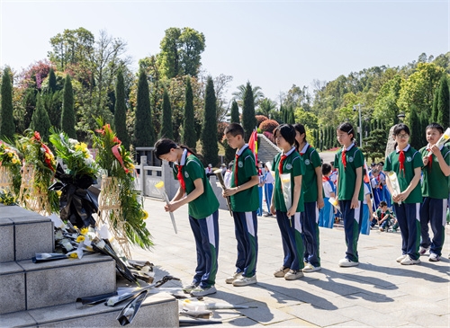 在庄严肃穆的烈士纪念碑前,雄壮的国歌声响彻云霄;少先队员以清越童声献唱《我们是共产主义接班人》;在讲述张超烈士为保护战机壮烈牺牲的事迹时,那“4.4秒生死抉择”的细节让不少师生热泪盈眶;随后,全体人员依次列队,向张超烈士墓敬献素菊;岳阳楼区副总辅导员陶阳带领全体少先队员呼号“时刻准备着”的誓言,在苍松翠柏间久久回荡。