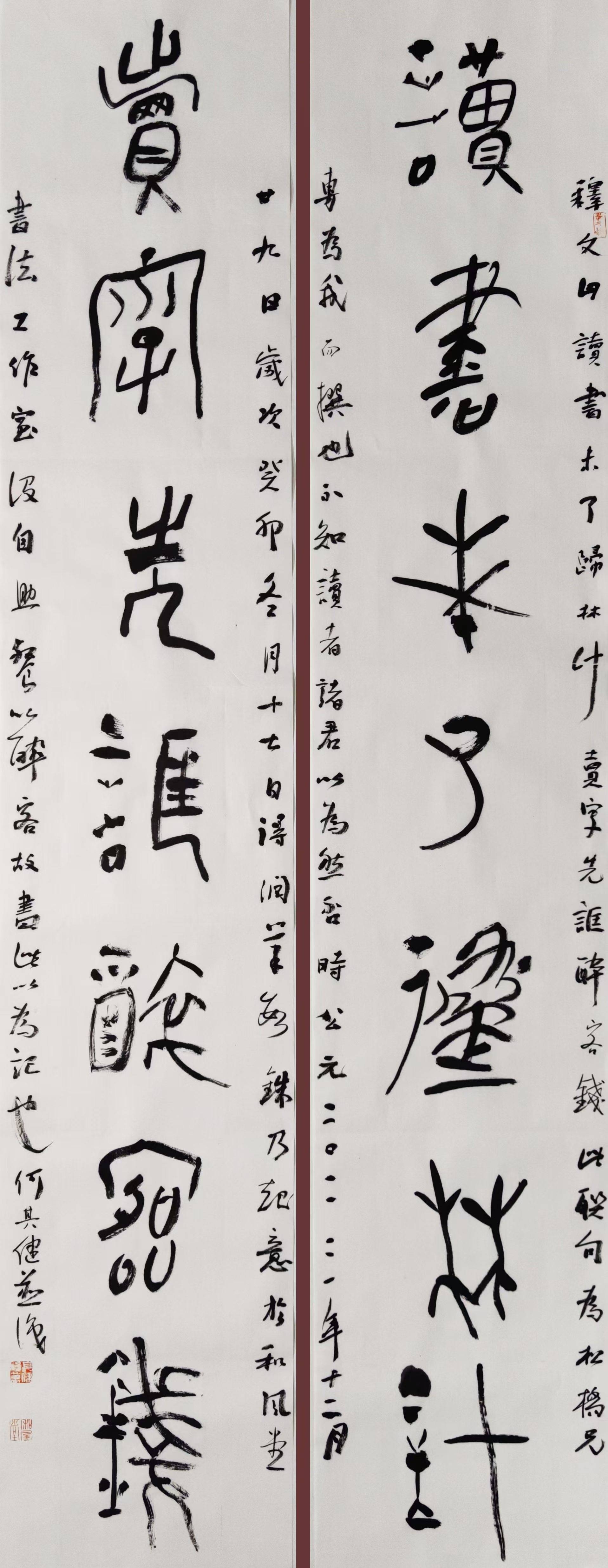说起结缘书法,其健的表述非常简单。幼年时,并无多少文化的工人父亲,曾经似无缘由地嘱咐过兄弟二人好好练字。但是,那时没人指点,没有字帖,就像无头苍蝇,由着兴致胡涂乱写。弄到一本残损的《五体书法字典》,也奉若至宝,敬若神明。在一度时期,甚至对炒得火热的虚浮名家也趋之如鹜。好在1992年,其健看到山谷道人的《诸上座帖》,顿觉眼前一亮,心生欢喜,可惜迫于生计,又一搁十年。下海之后,其健开始走入正道。其时,有外地书家调入当地,“僰风书社”良好运行,省市名家纷至沓来。于是,善纳雅言、乐于交游的何氏兄弟得益最多——其健成了珙县本土历史上第一个中国书法家协会会员。