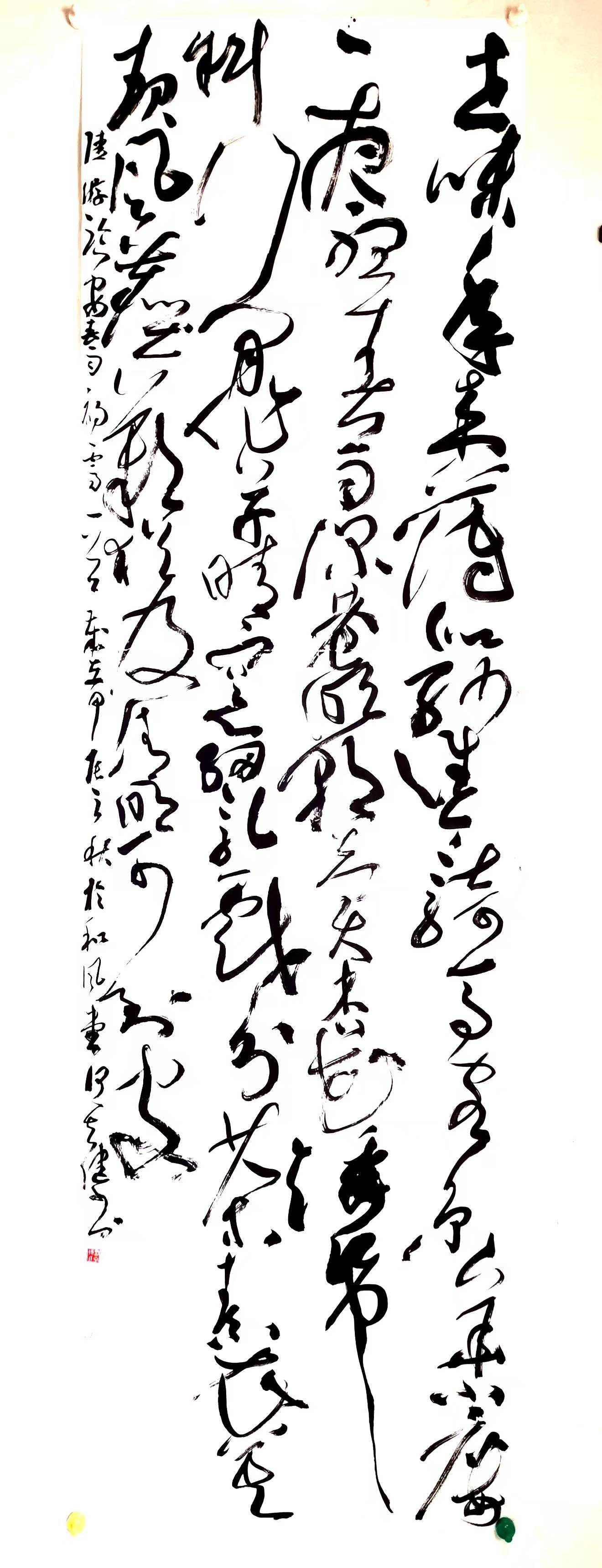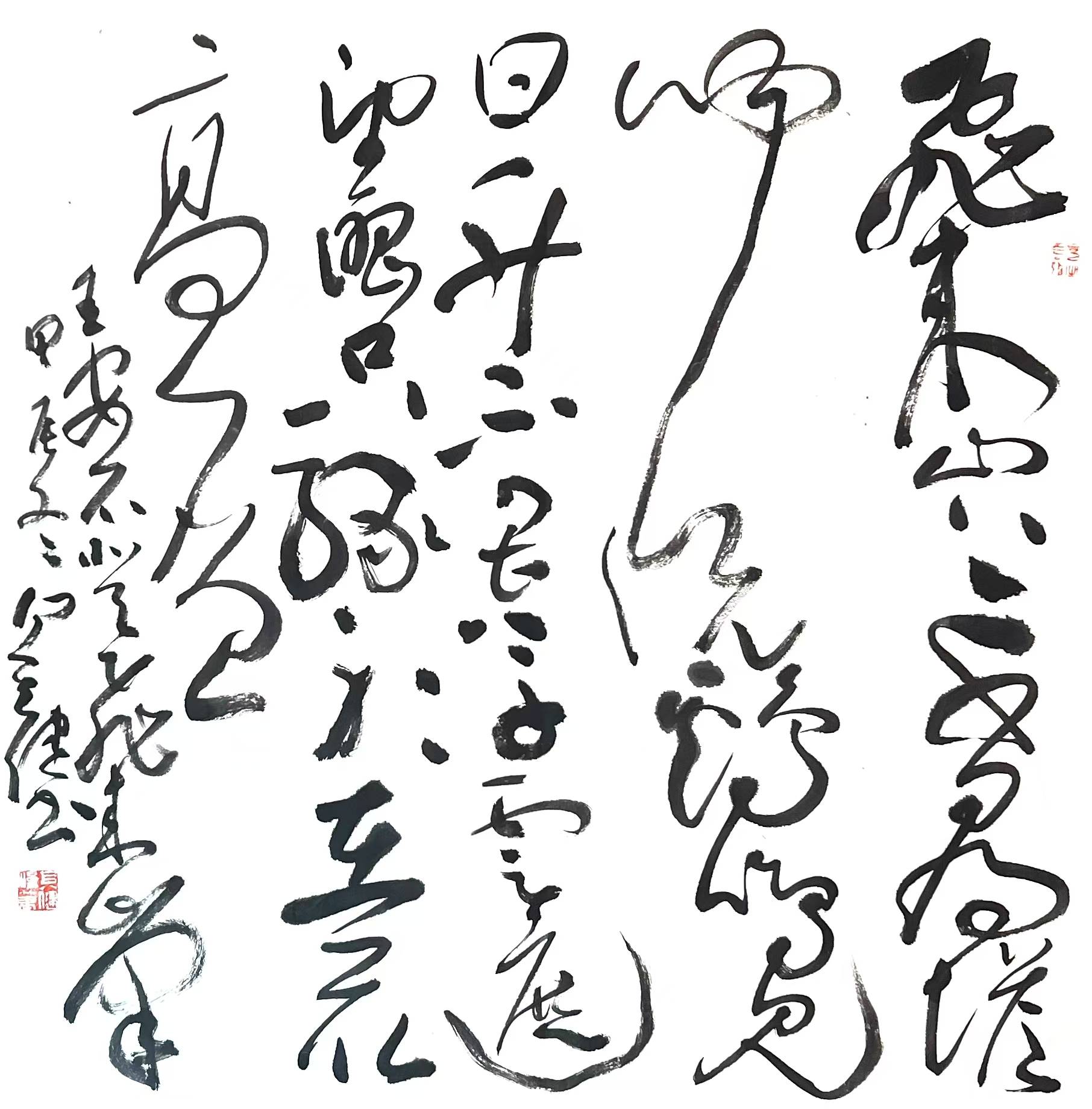 其健以草书见长,是而今川内屈指可数的青年草书家之一。其健的草书,渊源有自,山谷神韵一目了然,新颖章法令人眼热,墨色处理相对得当,整体风格阳刚雄强。其章法,灵活多变,纵横挥洒,一派天机,如大珠小珠落玉盘。其笔法,流畅、圆劲。厚者重、细者劲。以圆为主,圆中带方,方圆结合。其墨色,润含春雨,燥烈秋风。浓淡相间,枯湿得宜。对比强烈,但不花哨。其结体,参差错落,长短有态,粗细有致,奇正相生;其字法,或取自魏晋二王,或胎息颠张醉素,或神似山谷道人。面以庭坚为底,广涉当代书家;其风格,沉着雄强,有惊风挟雨之势,兼有唐风晋韵,显尽灵思妙想,展现出众才情,初成自家体数。